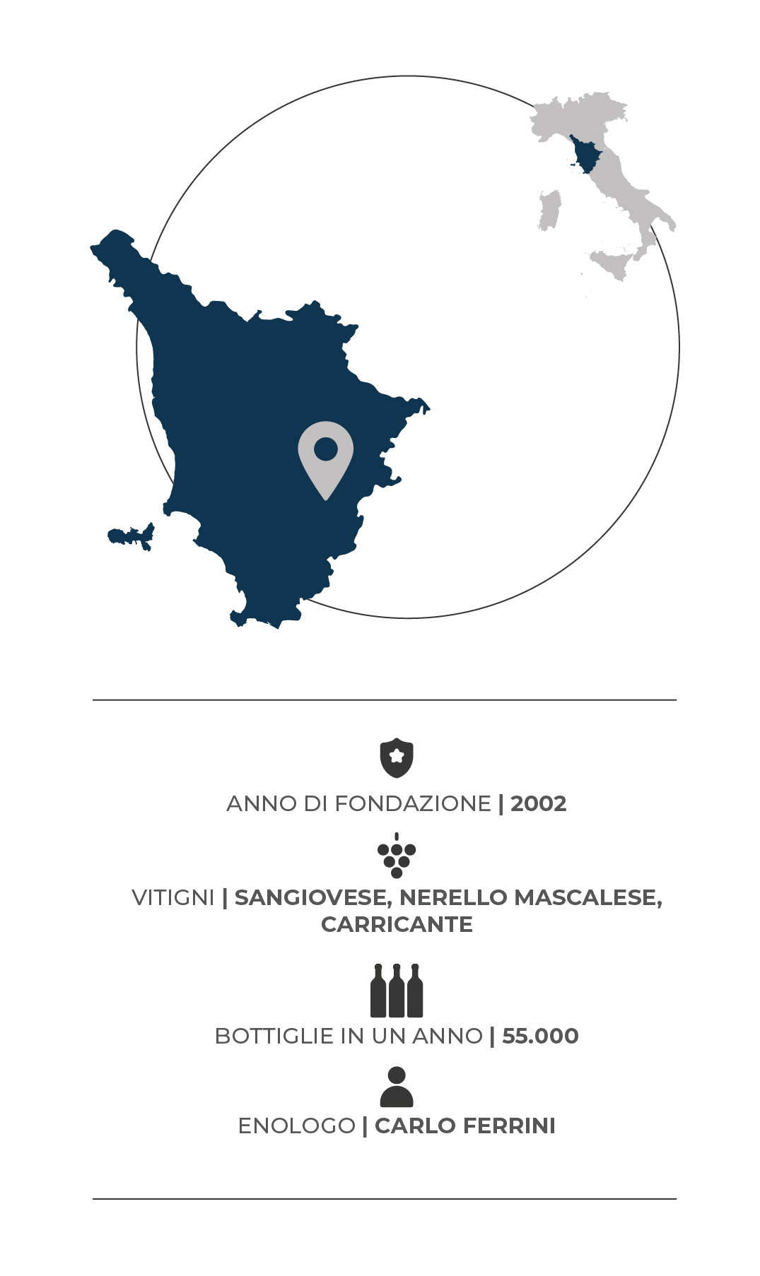 TIPOLOGIADOC Rosso di Montalcino ZONA PRODUTTIVAMontalcino (SI), a 400 metri s.l.m., in un vigneto di circa 1,5 ha esposto a sud est. VITIGNO100% Sangiovese TIPOLOGIA DEL TERRENOMedio impasto ricco di scheletro VINIFICAZIONE13 giorni di contatto con le bucce, di cui 7 giorni di fermentazione alcolica, in tini d’acciaio. Deléstage a metà fermentazione SISTEMA DI ALLEVAMENTOCordone speronato COLORERosso rubino brillante PROFUMOAl naso è fine e fragrante: ciliegia matura, lampone e fragolina di bosco, con richiami floreali di viola; sullo sfondo emergono spezie dolci e leggere note terrose ABBINAMENTIMolto gastronomico: salumi e crostini, primi al ragù, carni bianche arrosto, funghi e formaggi di media stagionatura SAPORESorso scorrevole, con una freschezza viva, tannino presente e ben integrato, equilibrio complessivo improntato alla bevibilità. Chiusura pulita, sapida, con ritorni di frutto rosso e spezia INVECCHIAMENTO12 mesi in parte in tini di legno e in parte in anfora di cocciopesto, seguiti da passaggio in cemento. Circa 6 mesi in bottiglia